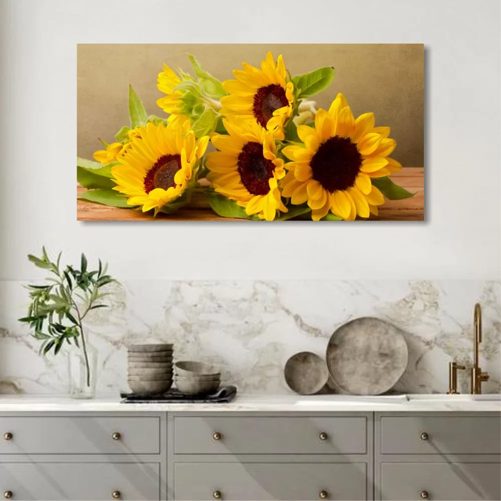 Quadro Girasoli Moderno: L’Essenza della Luce in Stile Rustico e Colori Caldi per Cucina e Ristorante