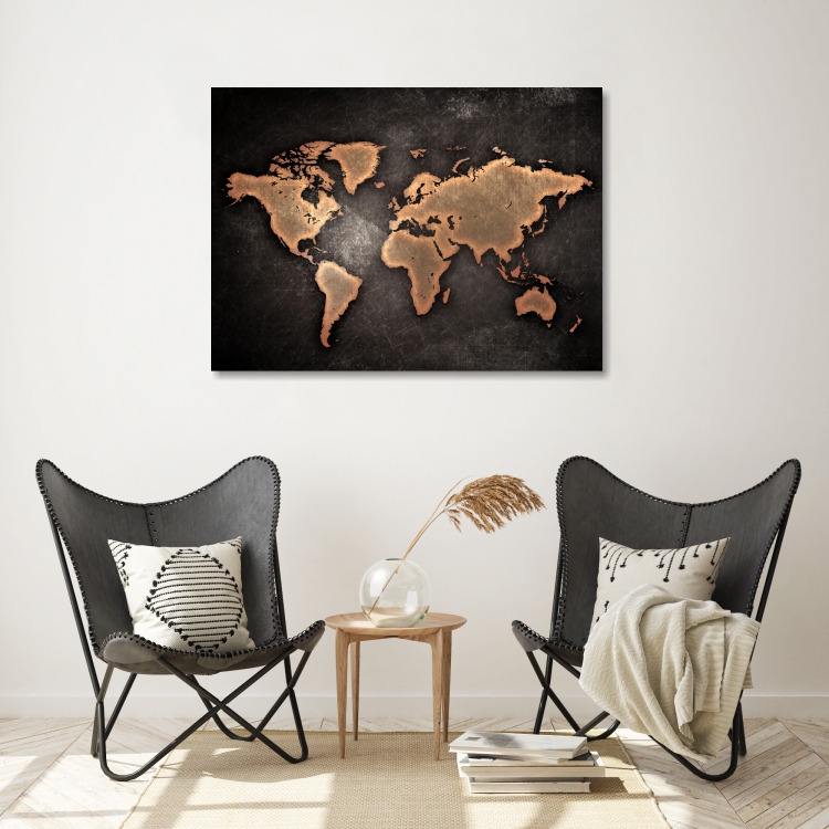 Il quadro mappamondo bronzo si integra perfettamente in ambienti dal gusto contemporaneo, industrial e minimal. È il quadro ideale per studi professionali, uffici moderni, sale riunioni, soggiorni con palette scure o neutre. Funziona sopra divani grigi o neri, su pareti bianche dove diventa l’unico punto focale, sopra credenze scure dove il contrasto bronzo-ardesia crea profondità. Altrettanto efficace in camera da letto per chi ama un’estetica decisa e raffinata.