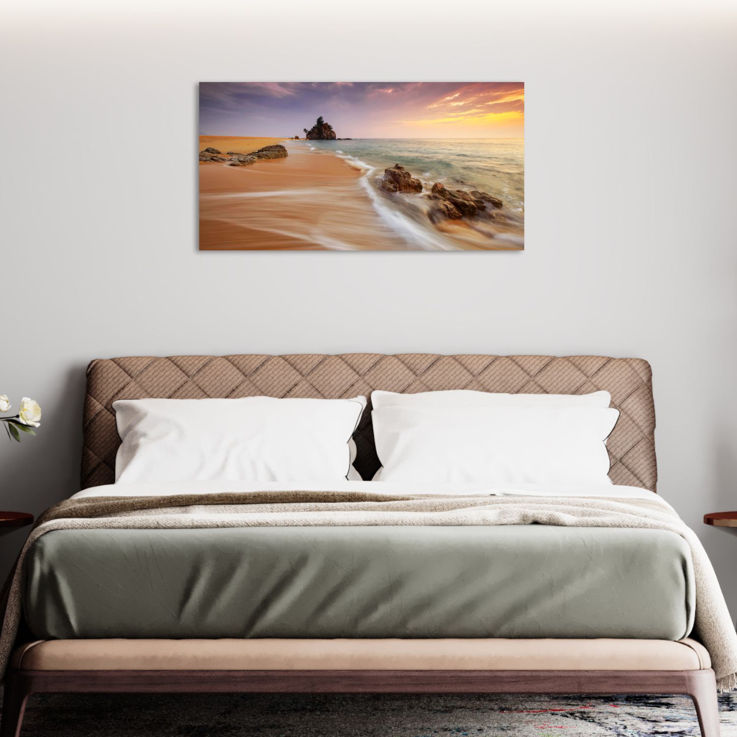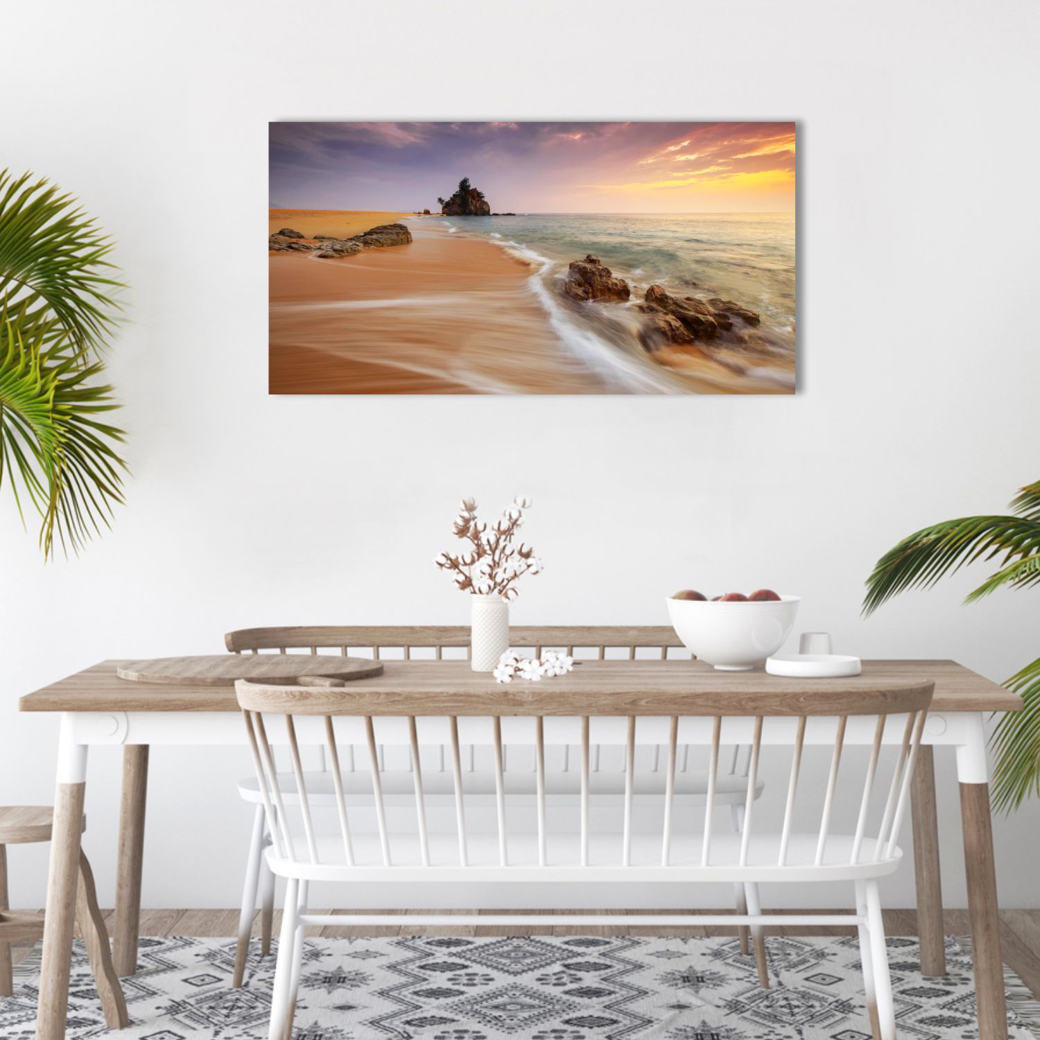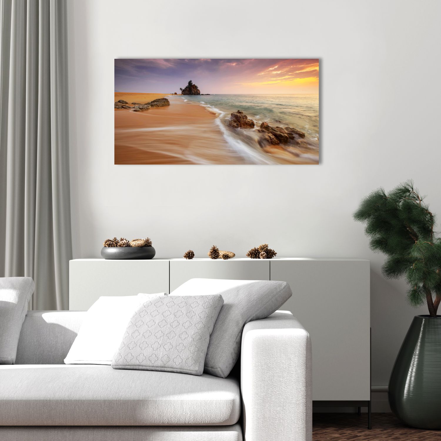 Scopri questo quadro mare moderno dalla composizione panoramica straordinaria: una spiaggia dorata, onde morbide in lunga esposizione e un isolotto solitario che si staglia contro un cielo infuocato al tramonto. Se stai cercando un quadro mare grande capace di diventare il vero protagonista della parete, questo è il pezzo che fa per te.